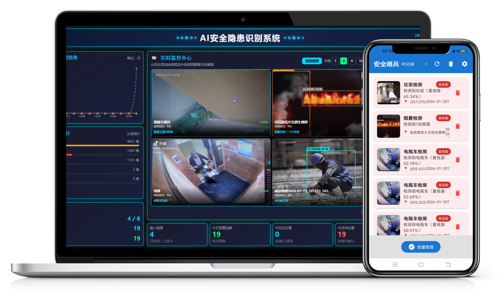 电脑端系统+手机端APP 网络中断不影响现场识别多算法实时运行和分析告警同步至监控室和手机 Contact us 产品应用场景 Product application scenarios 明火检测通过摄像头实时检测火灾和烟雾,一旦发现烟雾或者明火即告警 人员入侵识别发现有不明人员入侵后立即告警,减少不明身份人员带来的安全隐患 跌倒检测识别人员跌倒状态后立即告警,并通知管理人员前来查看 动物识别识别到动物(猫、狗、老鼠等)立即告警,减少未知风险 我们的优势 充分利旧 利用现有摄像头增加算法功能,减少新安装摄像头成本 灵活配置 多种配置方案,本地化霍网络化部署可选,可测试算法 及时响应 技术人员及时跟进解决保障售后,确保风险及时被处理 安装方便 条件具备半天左右即可完成安装,不影响现有监控使用